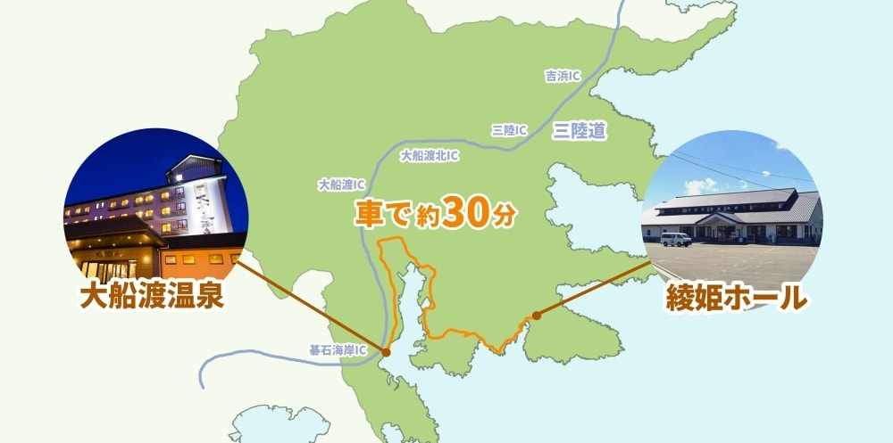 綾姫ホールと大船渡温泉間の移動については、